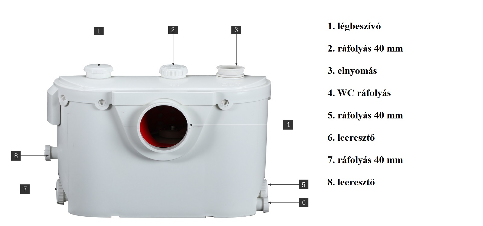 WC, 1 felső és 2 oldalsó rákötési lehetőség